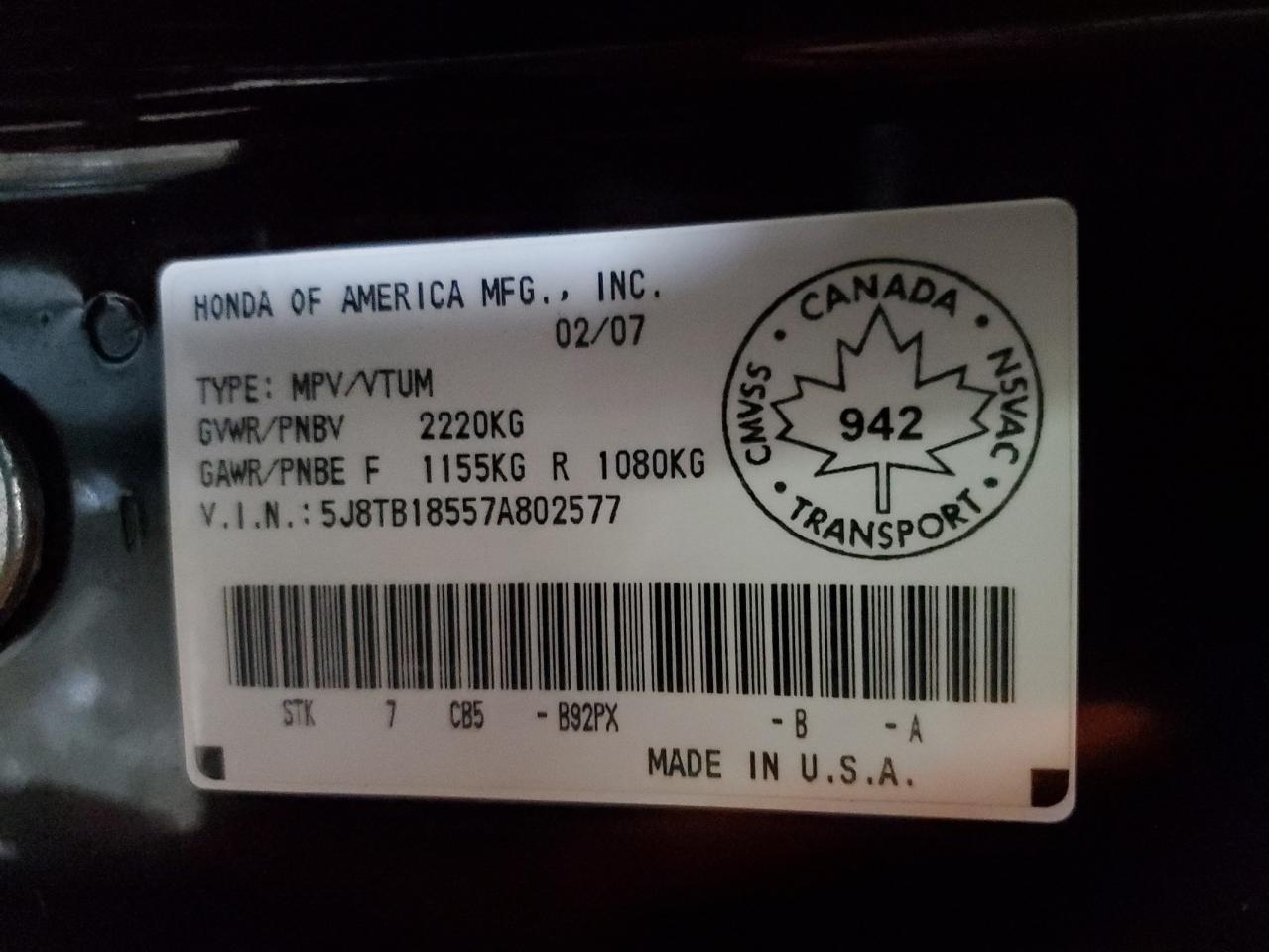 - ВИН: 5J8TB18557A******