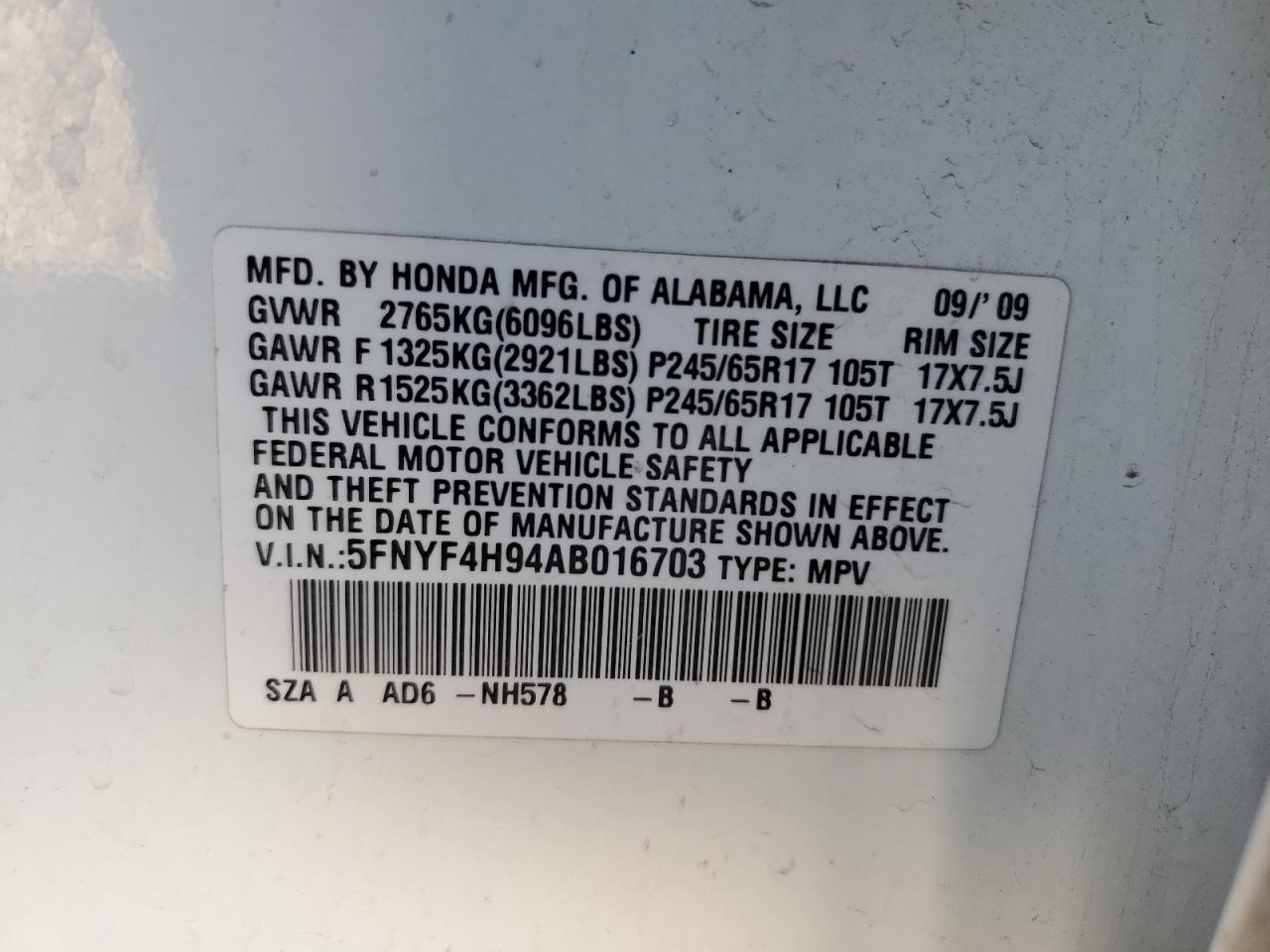 - ВИН: 5FNYF4H94AB******