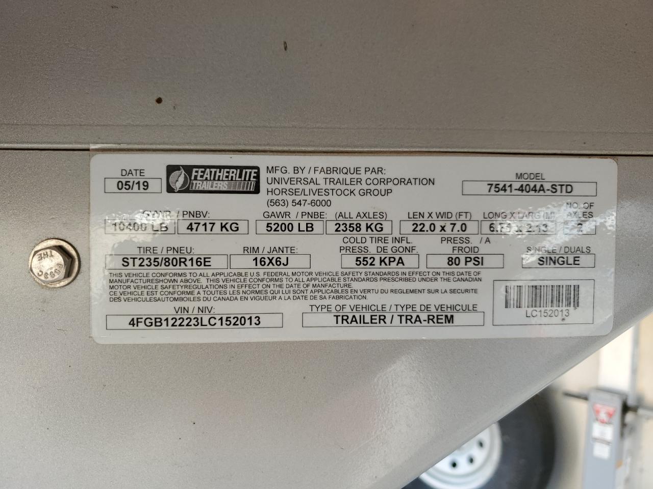 2020 UNIVERSAL LIVESTOCK TRAILER