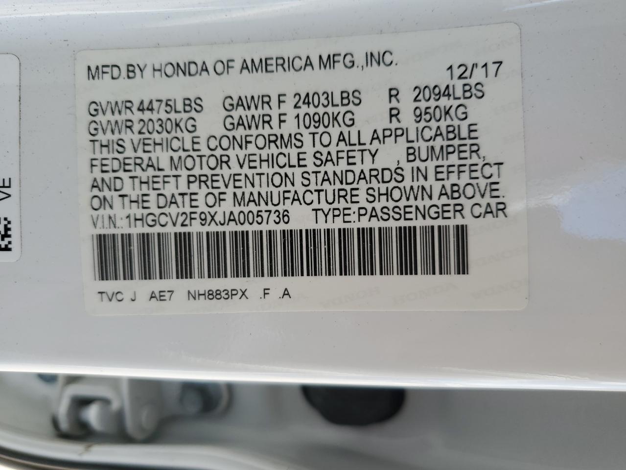 - ВИН: 1HGCV2F9XJA******
