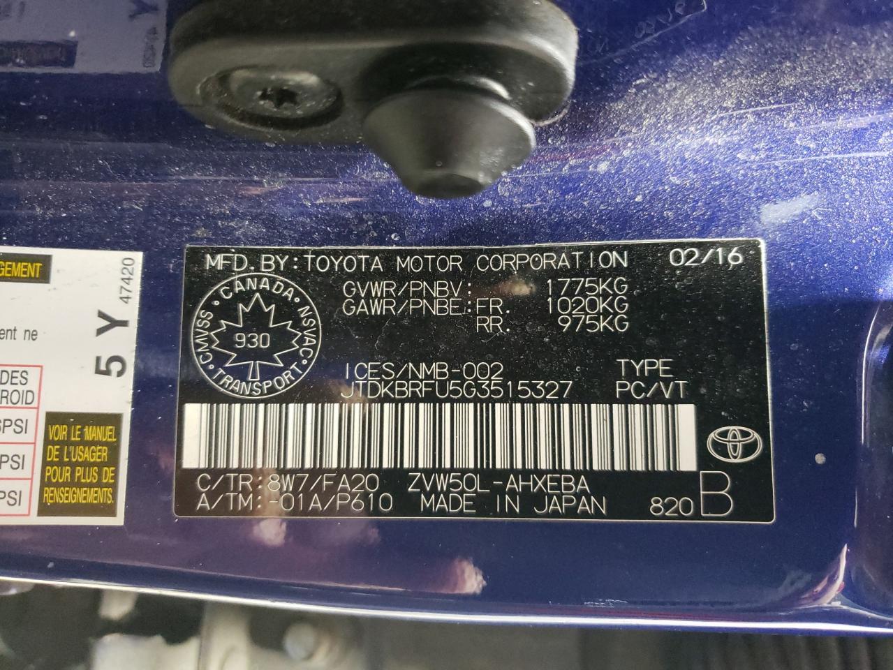 - ВИН: JTDKBRFU5G3******