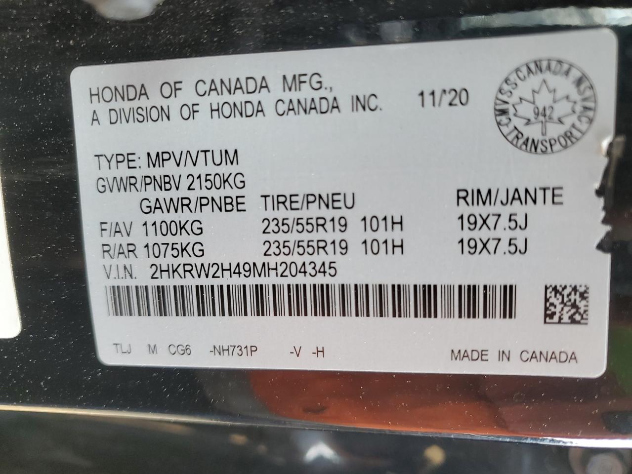 - ВИН: 2HKRW2H49MH******