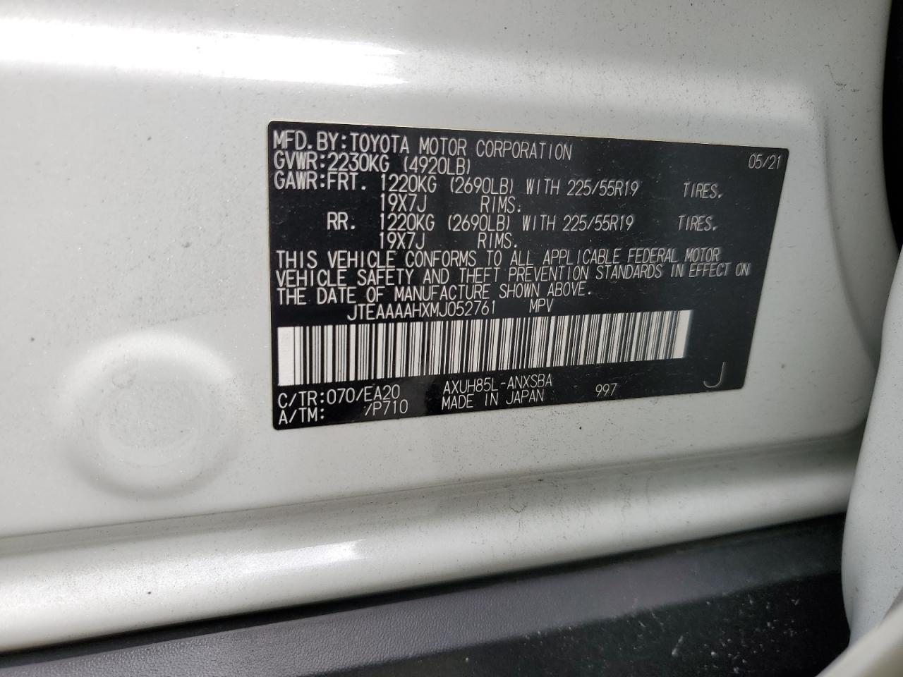 - ВИН: JTEAAAAHXMJ******