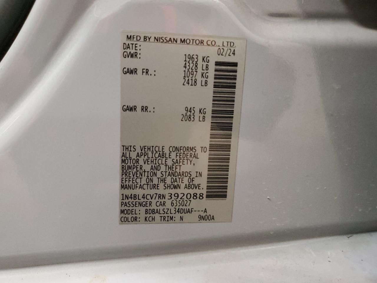 - ВИН: 1N4BL4CV7RN******