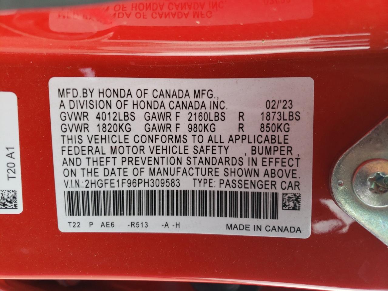 - ВИН: 2HGFE1F96PH******