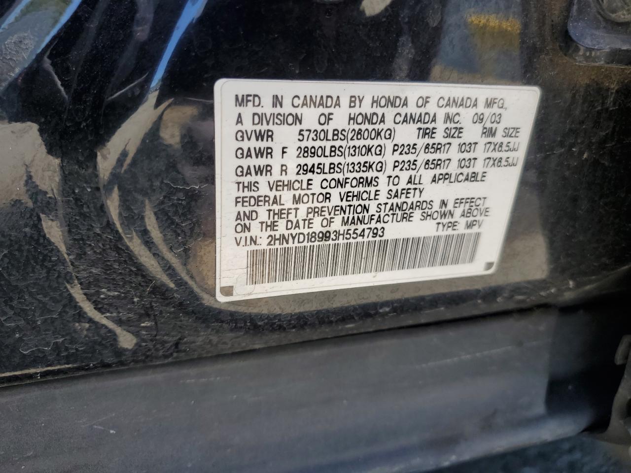 - ВИН: 2HNYD18993H******