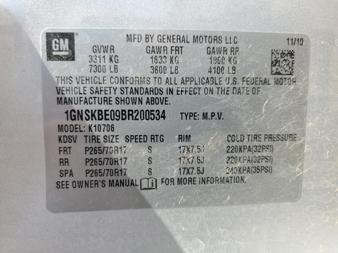 - ВИН: 1GNSKBE09BR******