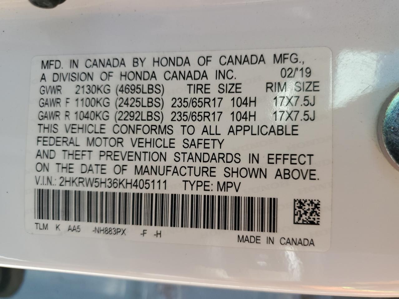 - ВИН: 2HKRW5H36KH******