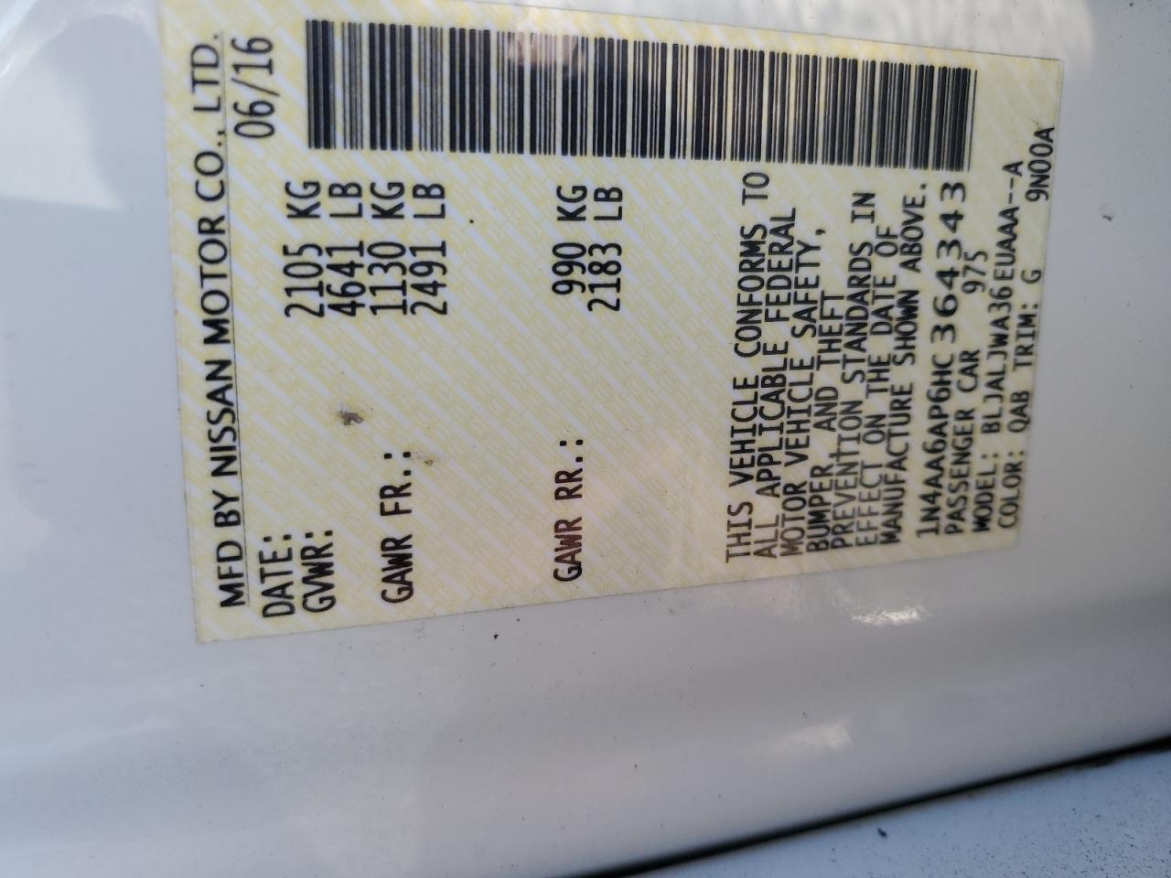 - ВИН: 1N4AA6AP6HC******
