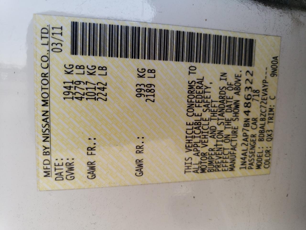 - ВИН: 1N4AL2AP7BN******