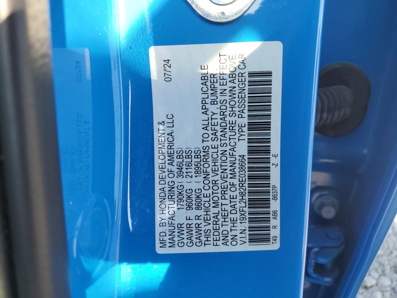 - ВИН: 19XFL2H82RE******