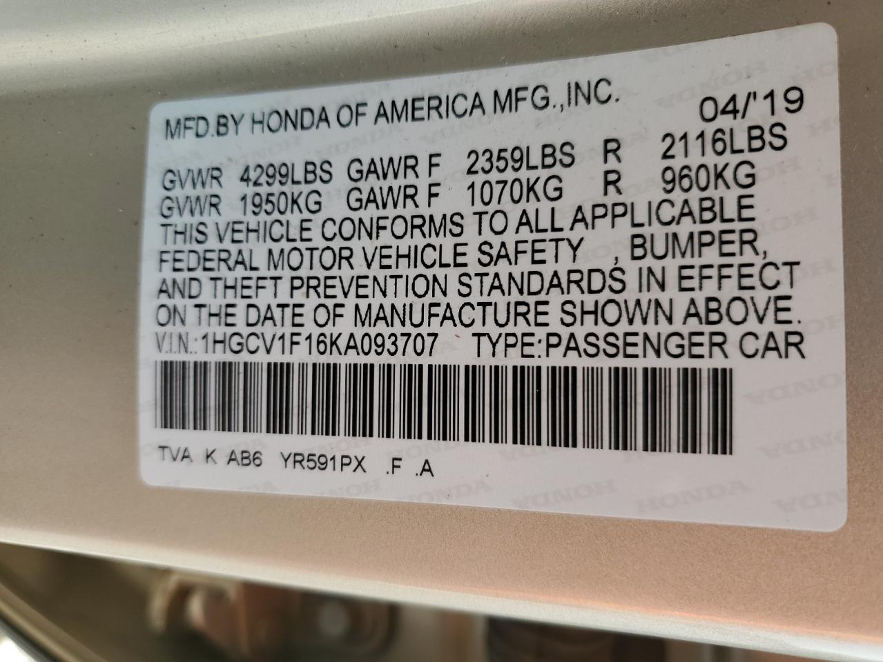 - ВИН: 1HGCV1F16KA******
