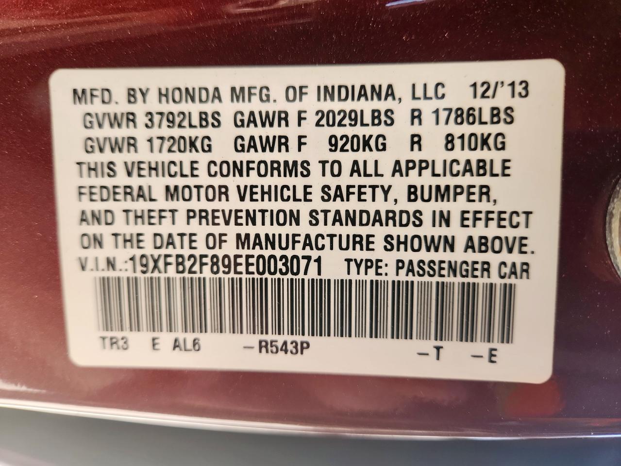 - ВИН: 19XFB2F89EE******