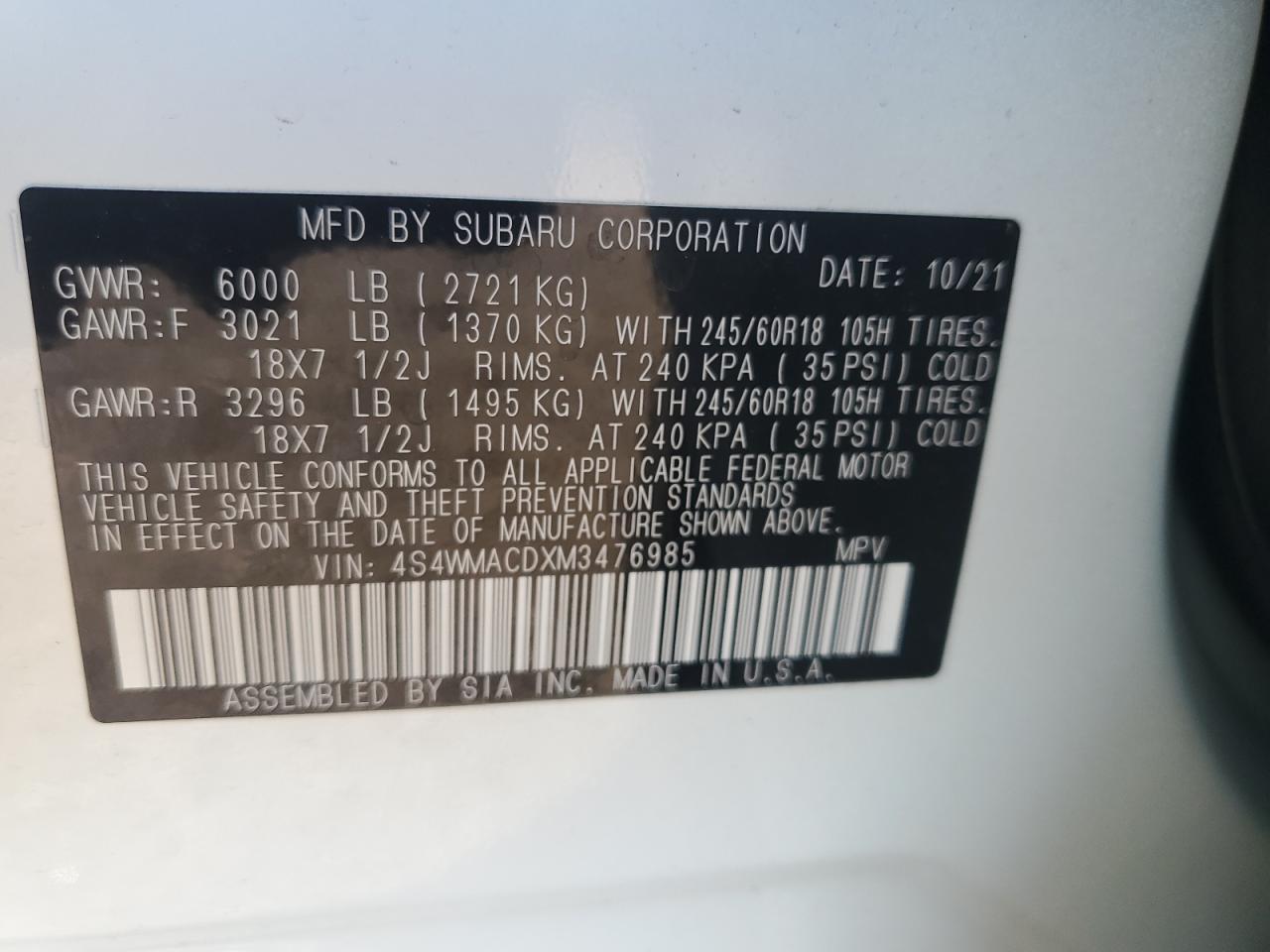 2021 SUBARU ASCENT PREMIUM из США