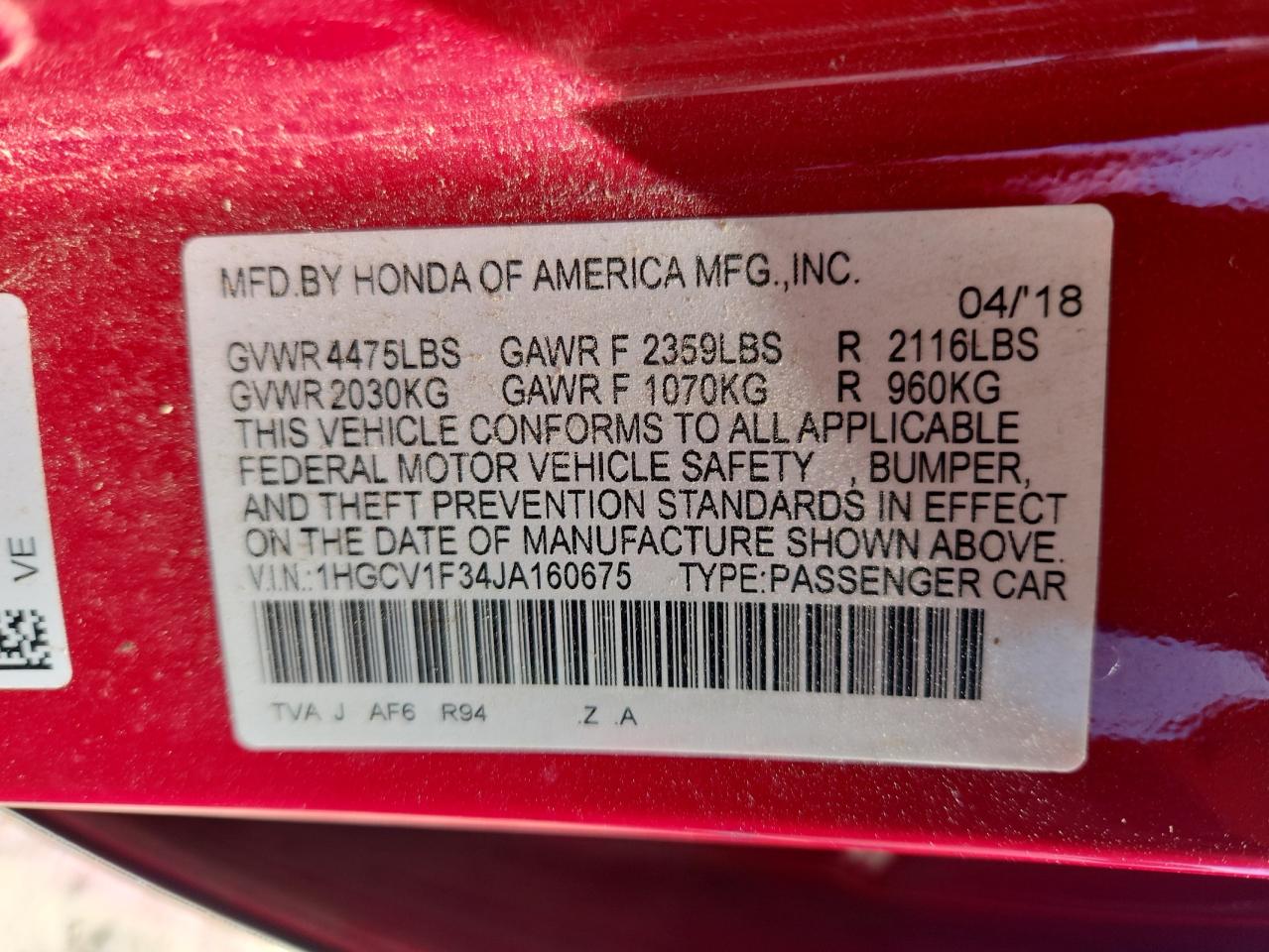 - ВИН: 1HGCV1F34JA******