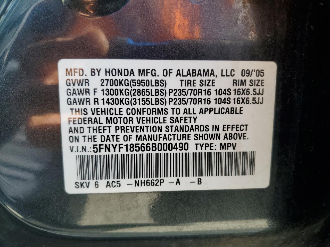 - ВИН: 5FNYF18566B******