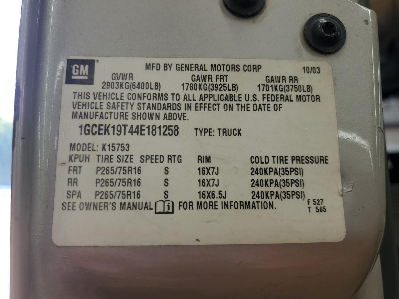 - ВИН: 1GCEK19T44E******