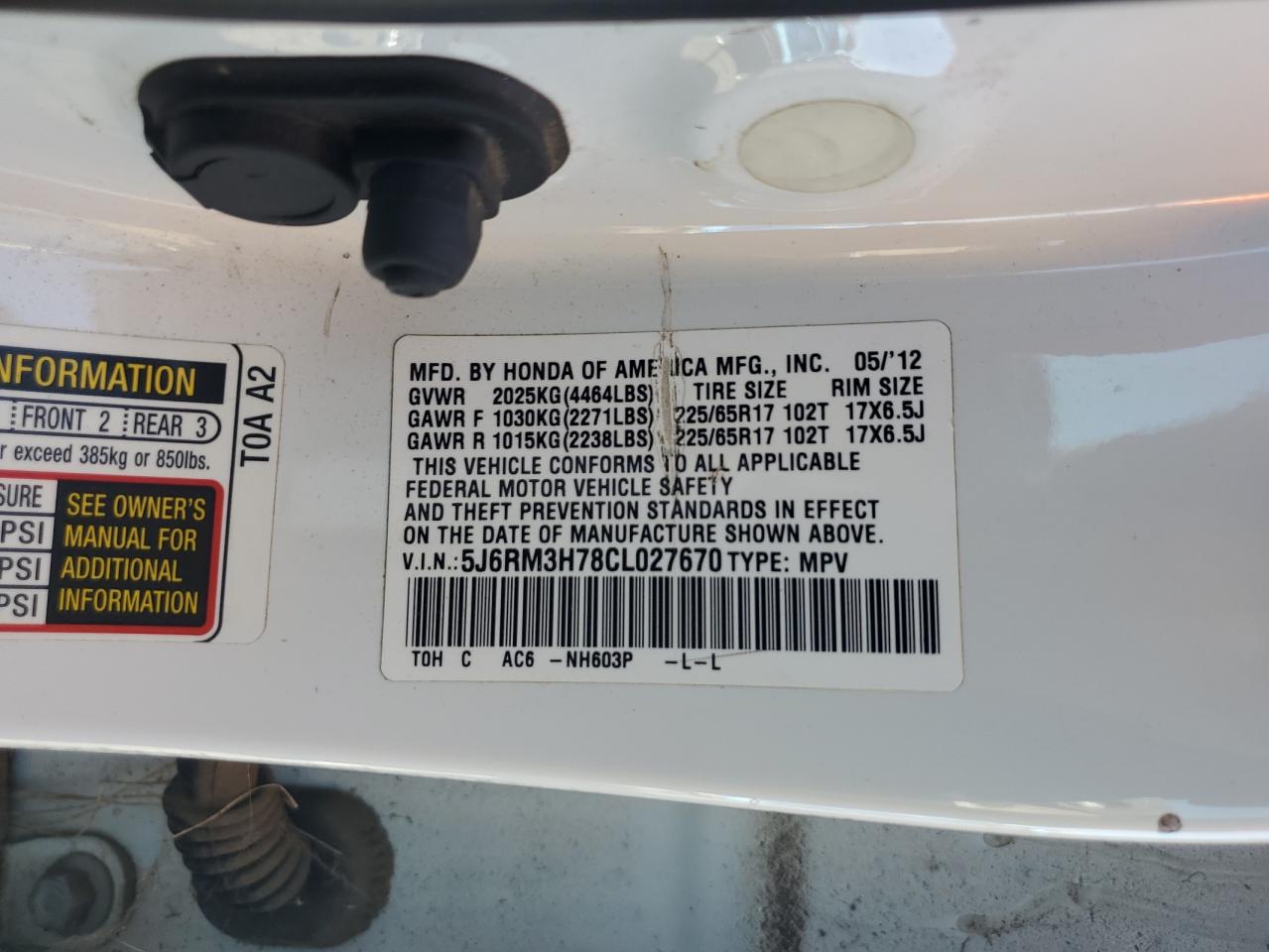 - ВИН: 5J6RM3H78CL******