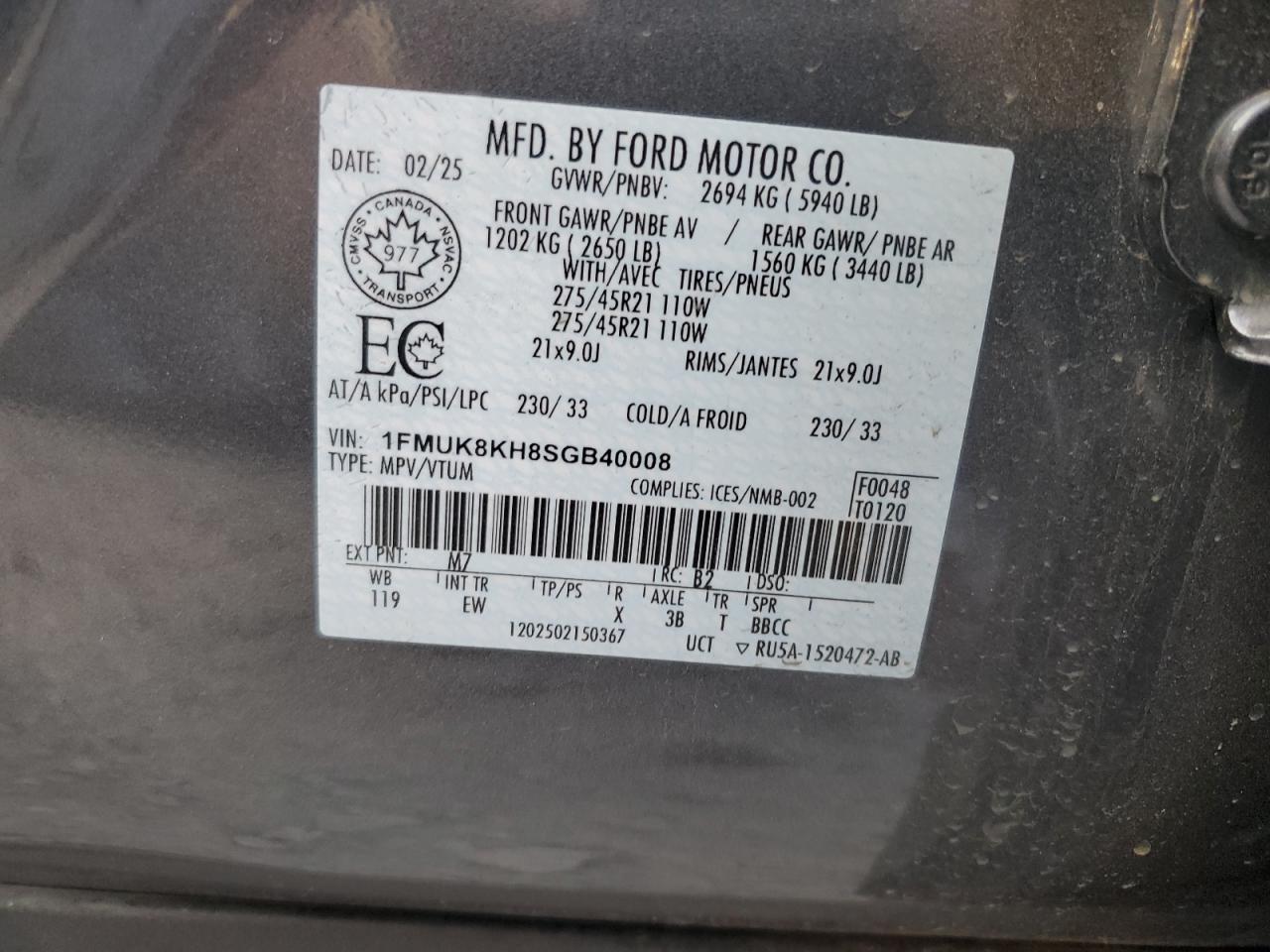 - ВИН: 1FMUK8KH8SG******