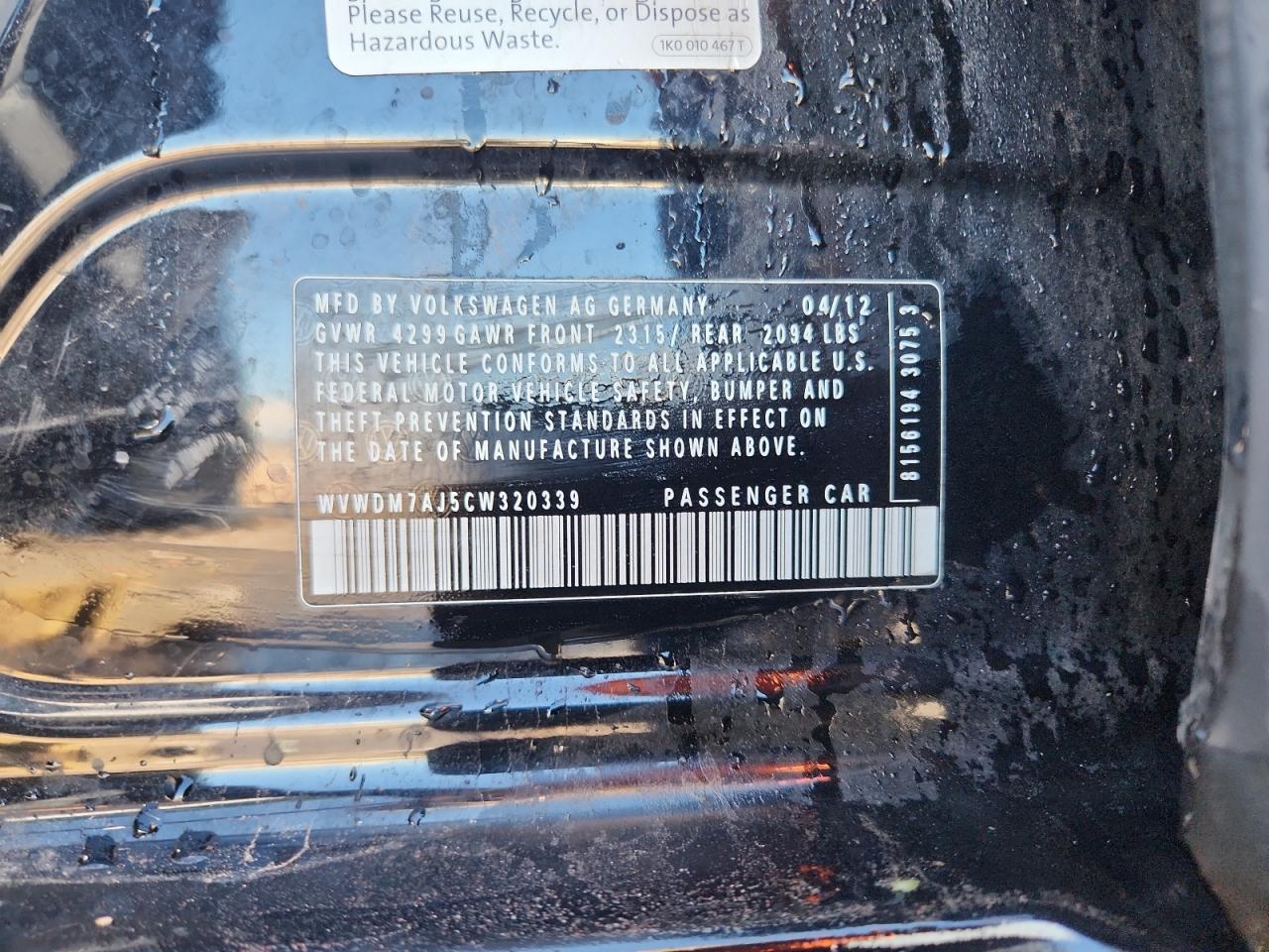 - ВИН: WVWDM7AJ5CW******