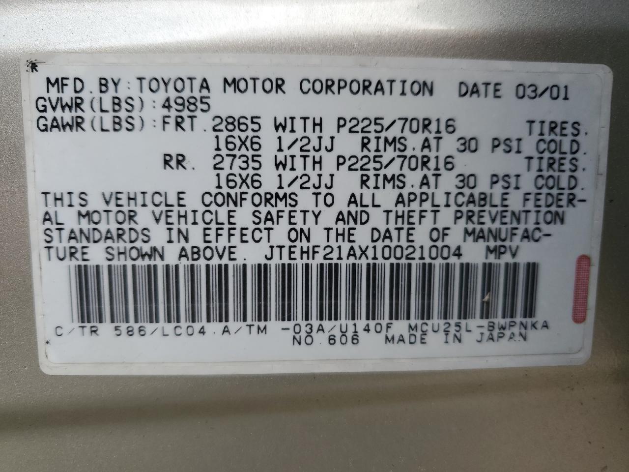 - ВИН: JTEHF21AX10******