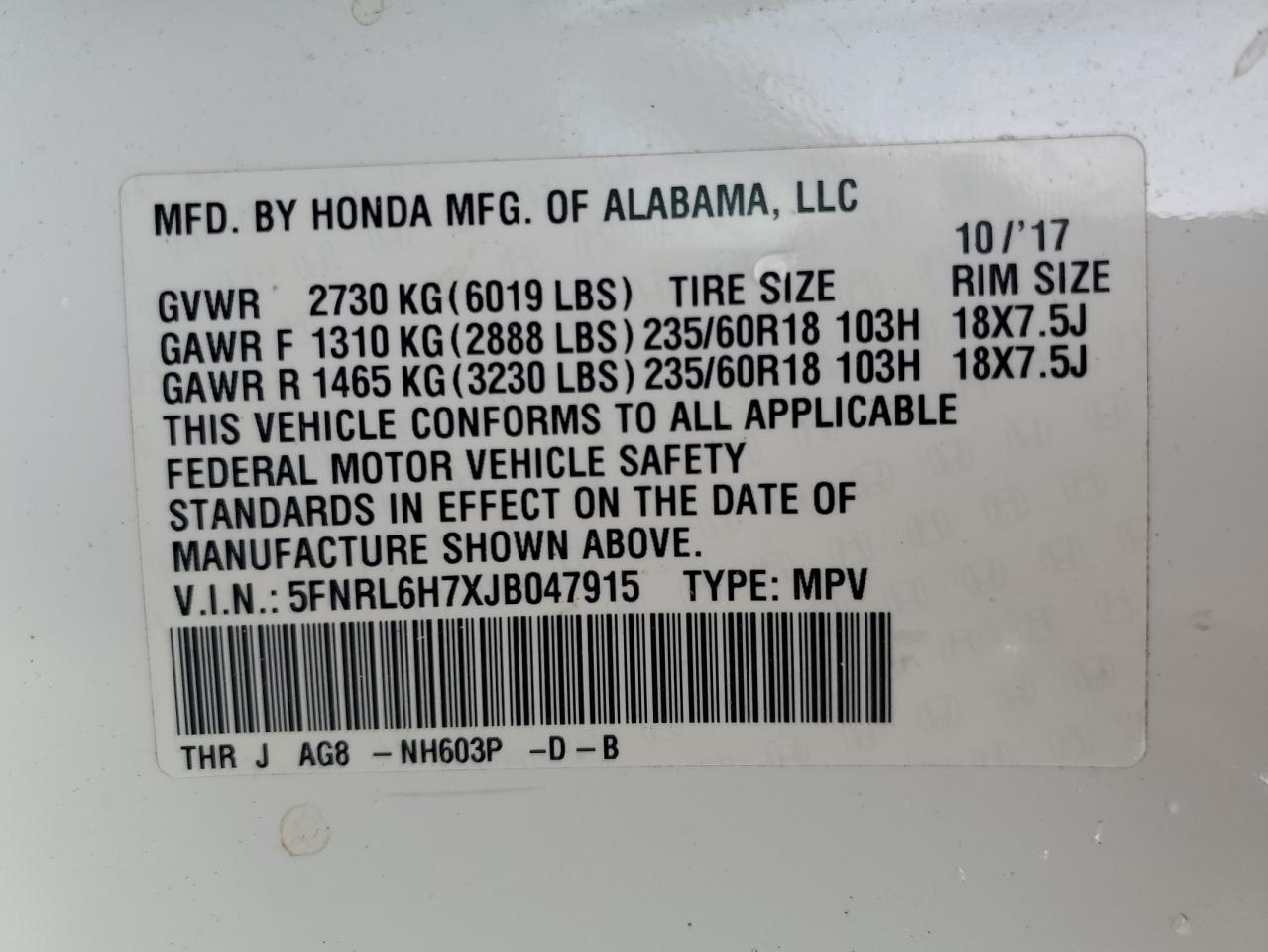 - ВИН: 5FNRL6H7XJB******