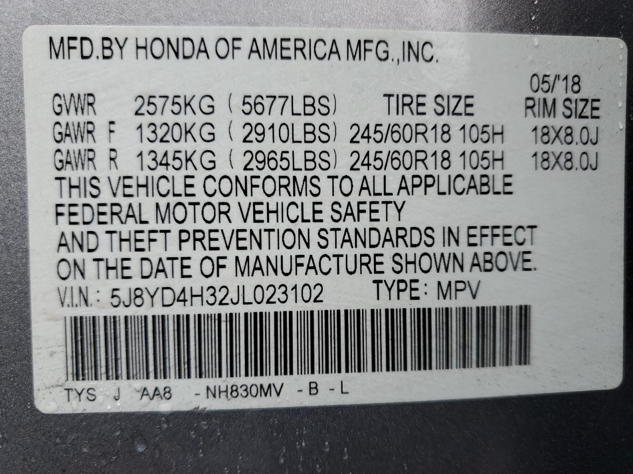 - ВИН: 5J8YD4H32JL******