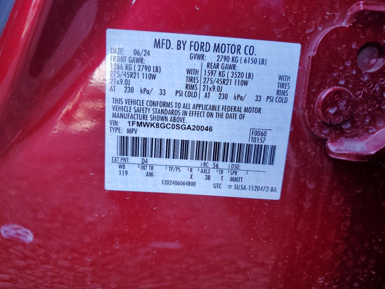 - ВИН: 1FMWK8GC0SG******