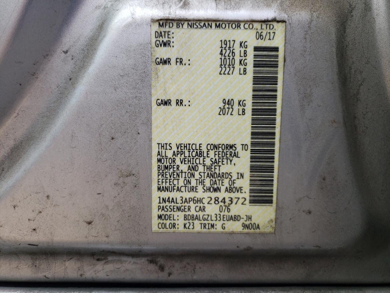 - ВИН: 1N4AL3AP6HC******