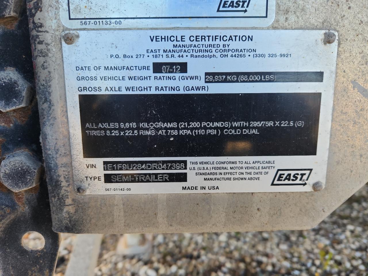 2013 EAST MANUFACTURING END DUMP TRAILER из США