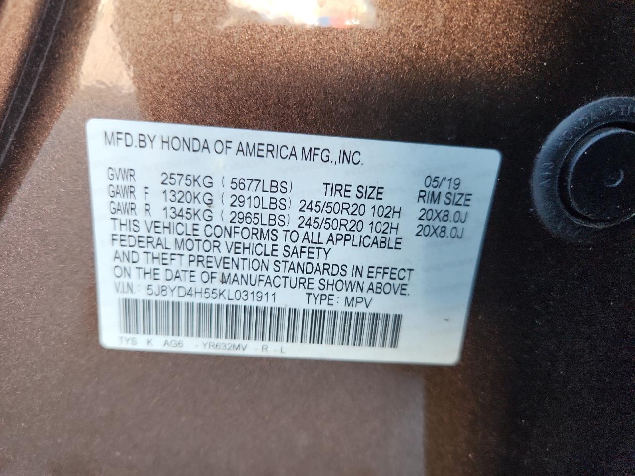 - ВИН: 5J8YD4H55KL******