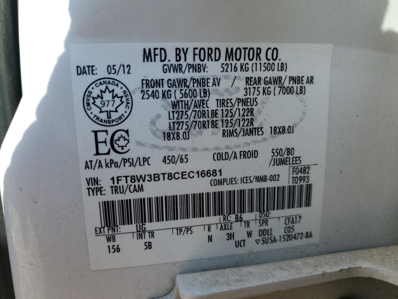 - ВИН: 1FT8W3BT8CE******