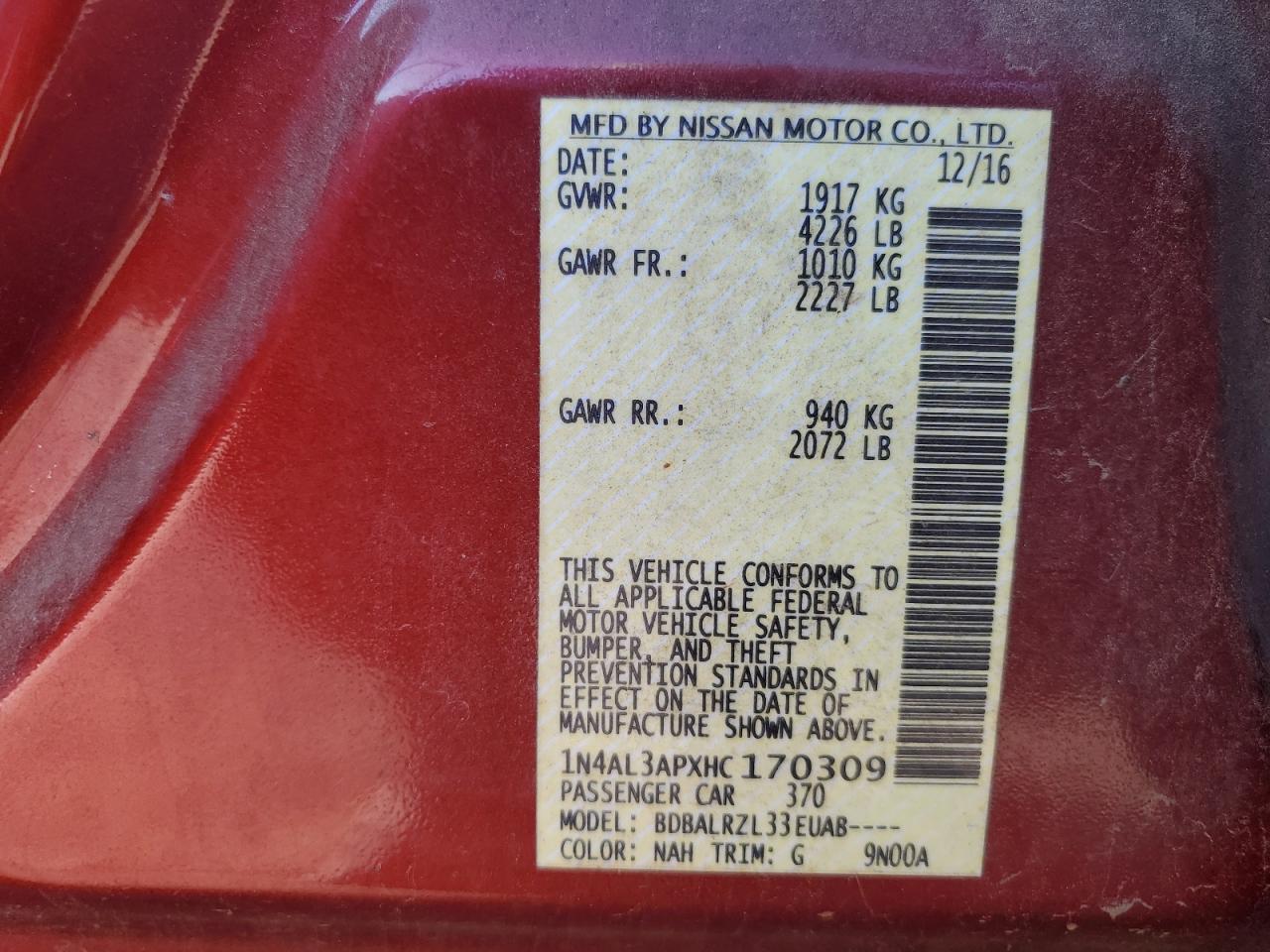 - ВИН: 1N4AL3APXHC******