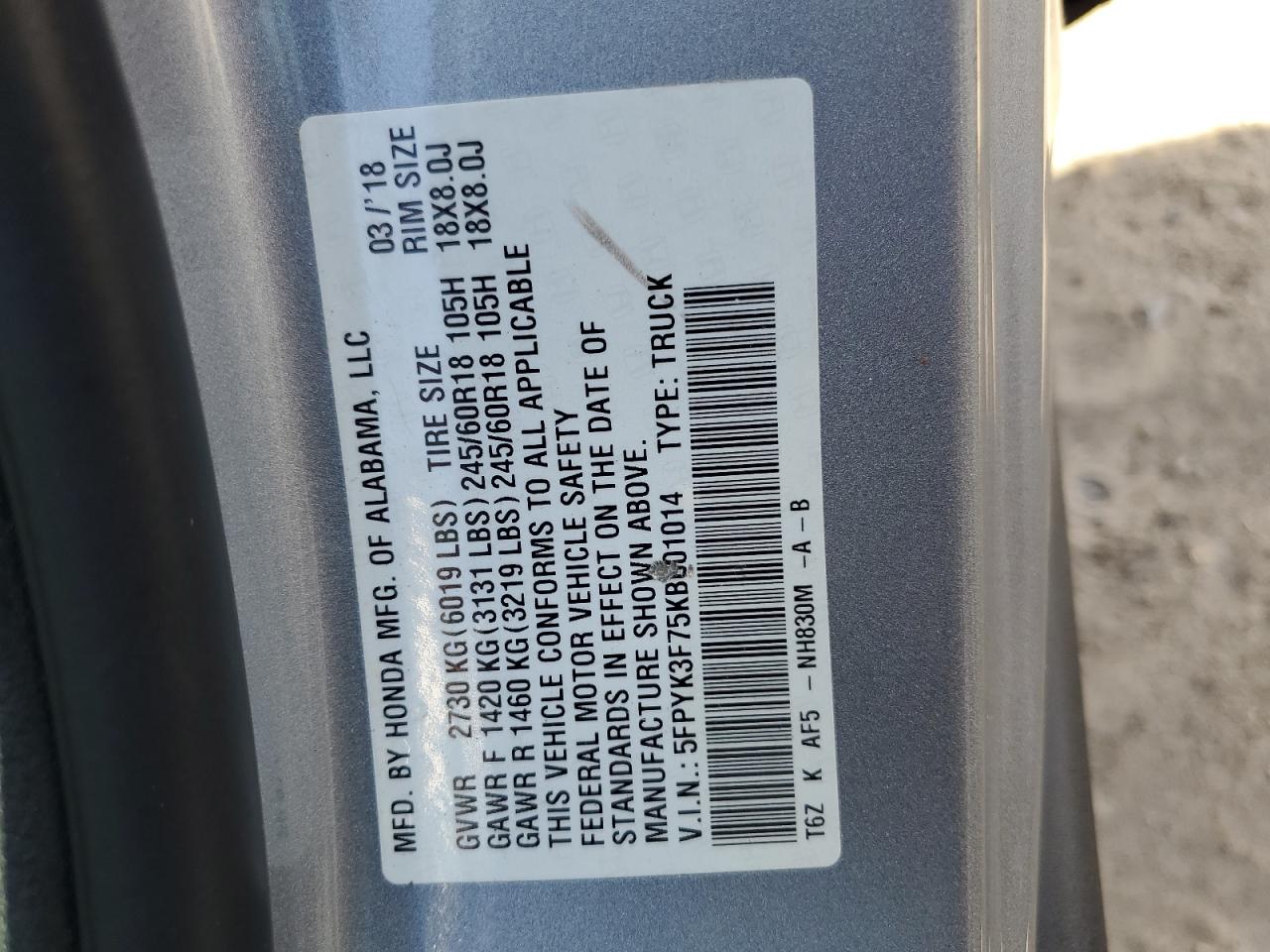 - ВИН: 5FPYK3F75KB******