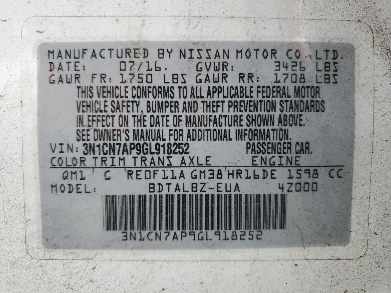 - ВИН: 3N1CN7AP9GL******