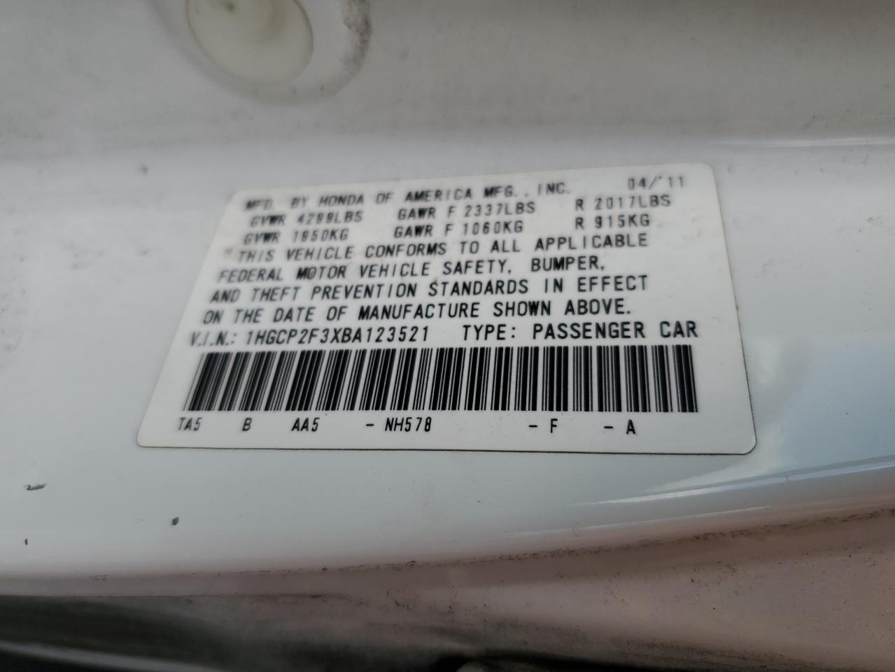 - ВИН: 1HGCP2F3XBA******