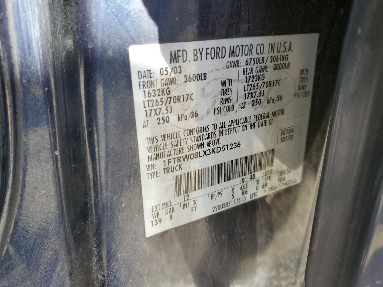 - ВИН: 1FTRW08LX3K******