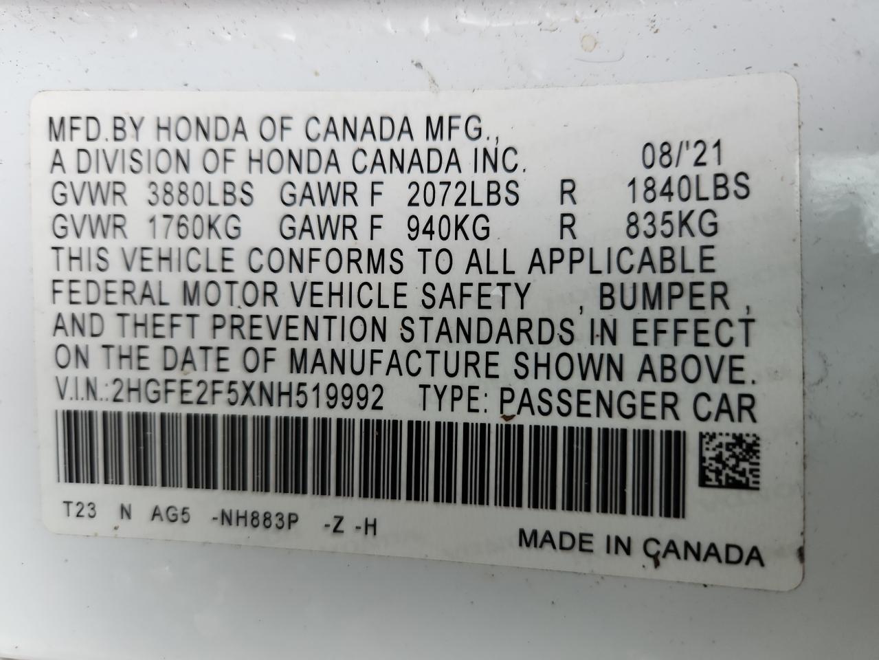 - ВИН: 2HGFE2F5XNH******