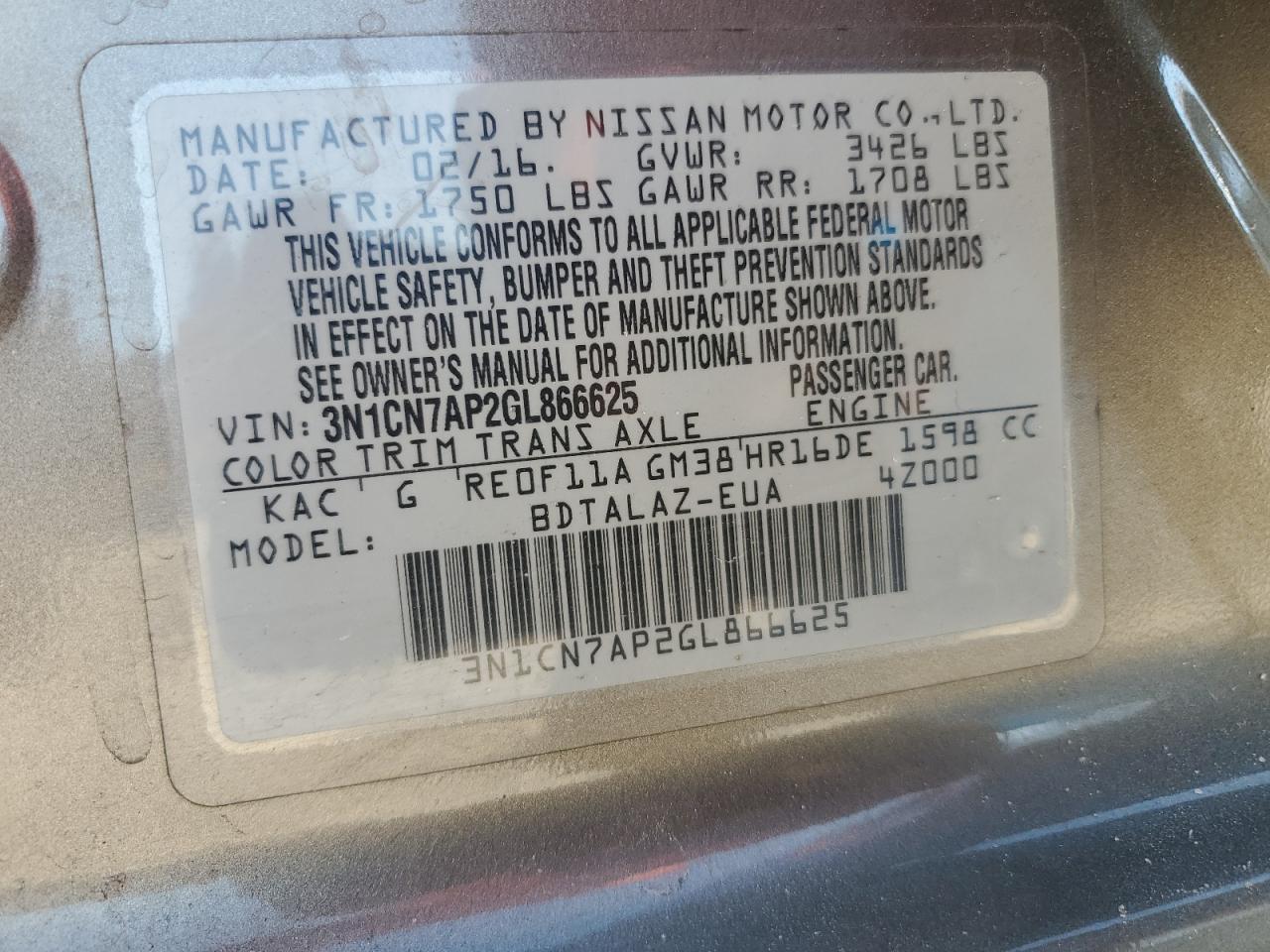 - ВИН: 3N1CN7AP2GL******