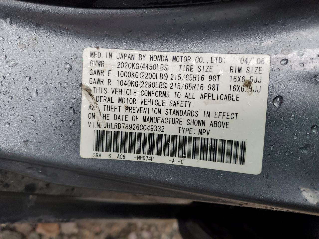 - ВИН: JHLRD78926C******