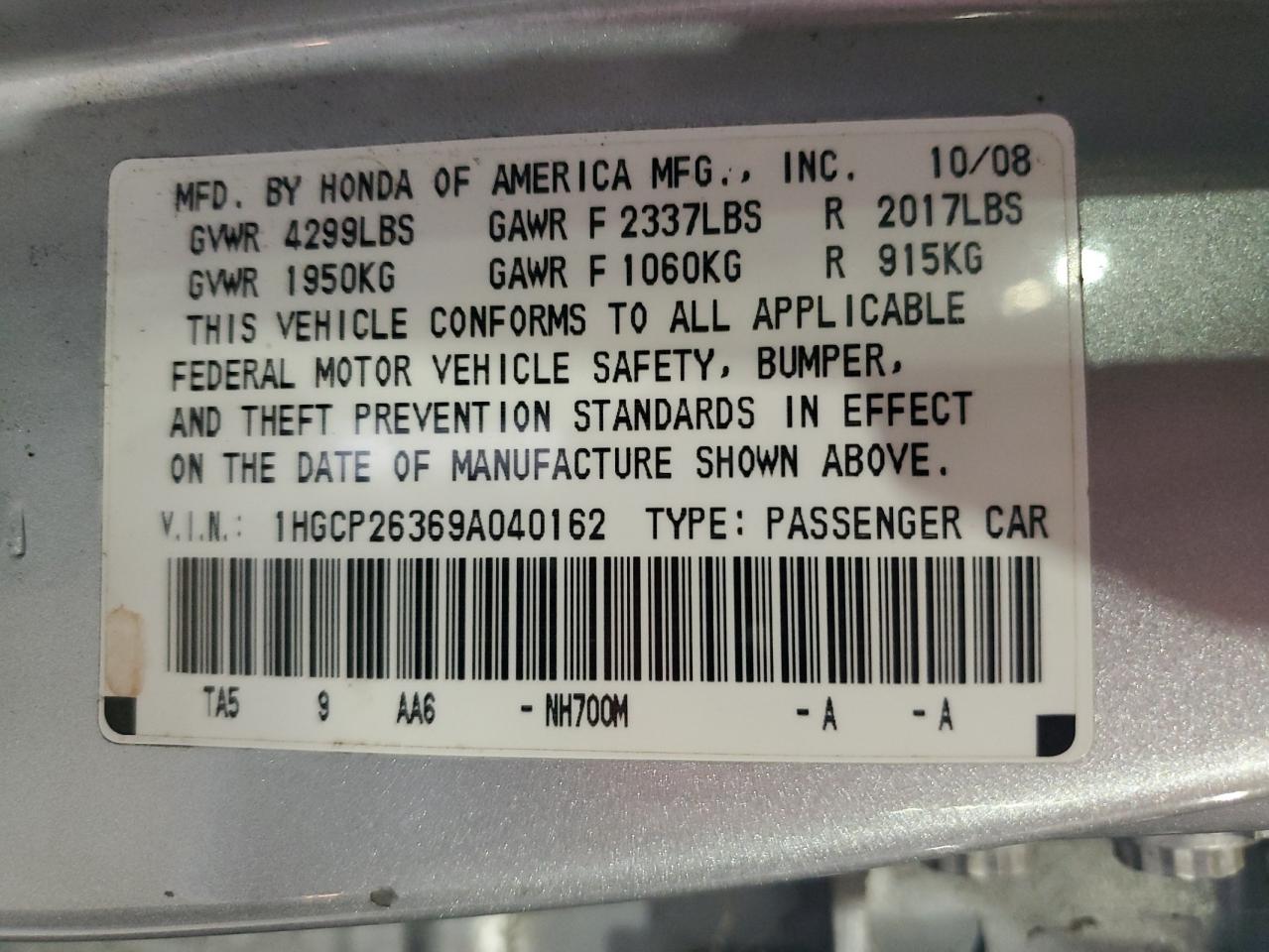 - ВИН: 1HGCP26369A******