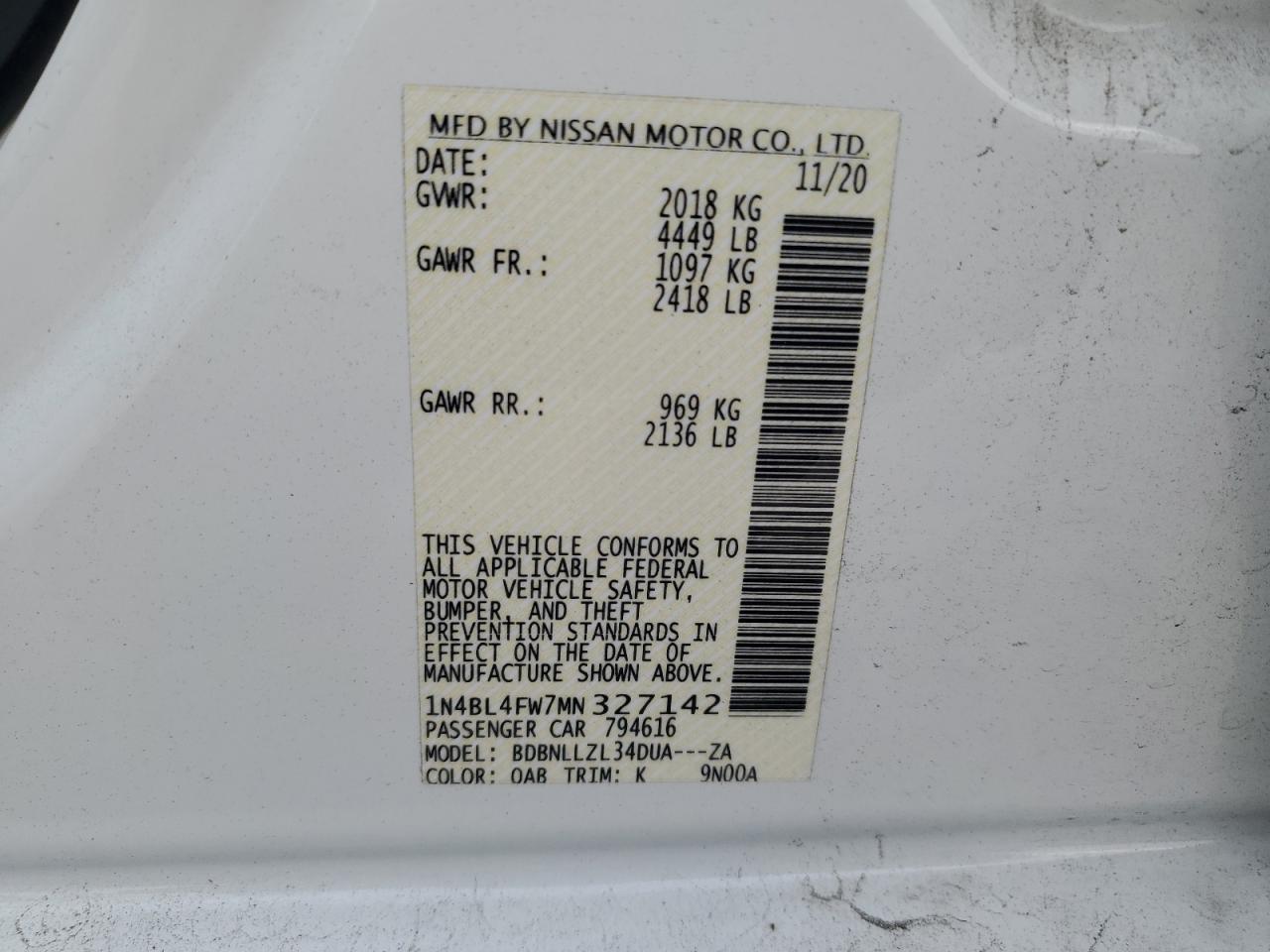 - ВИН: 1N4BL4FW7MN******