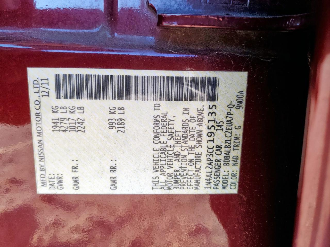 - ВИН: 1N4AL2AP3CC******