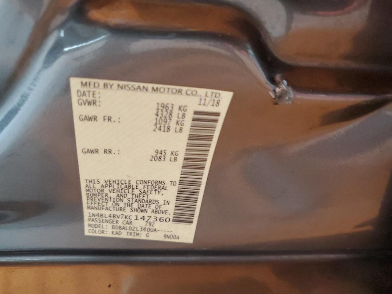 - ВИН: 1N4BL4BV7KC******