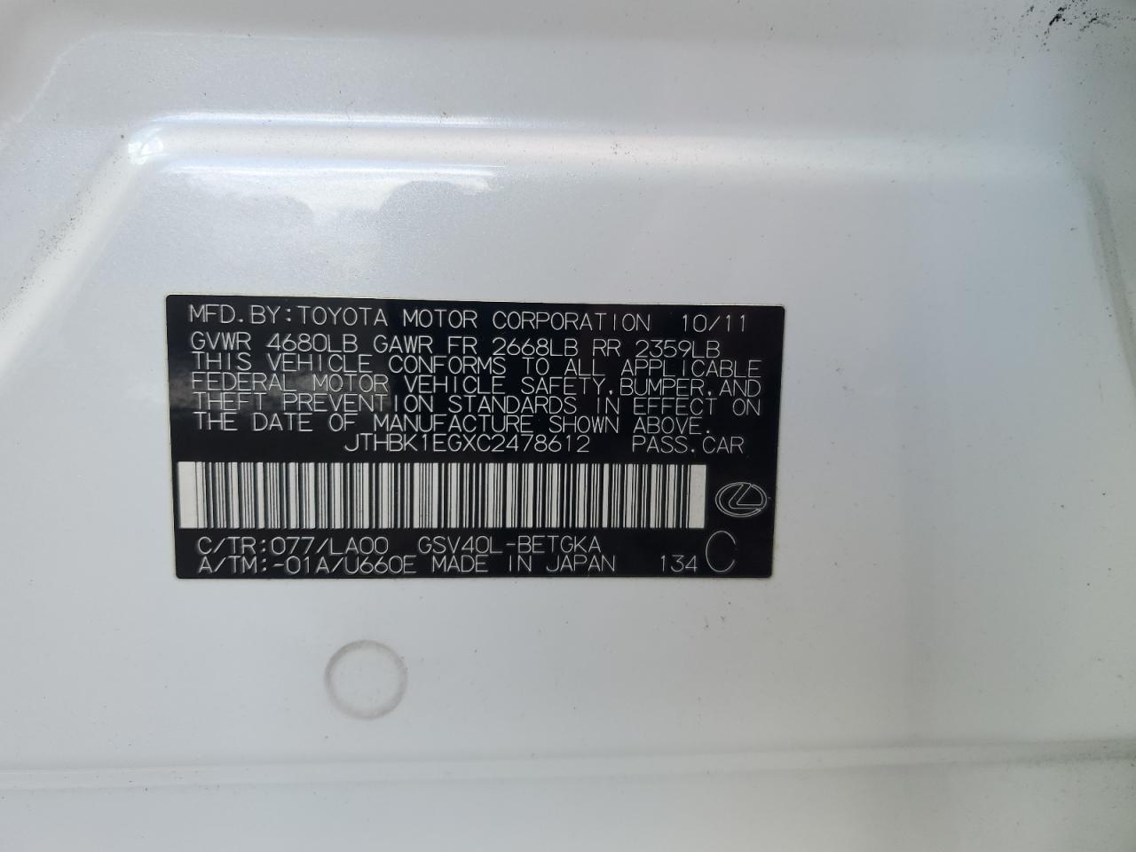 - ВИН: JTHBK1EGXC2******