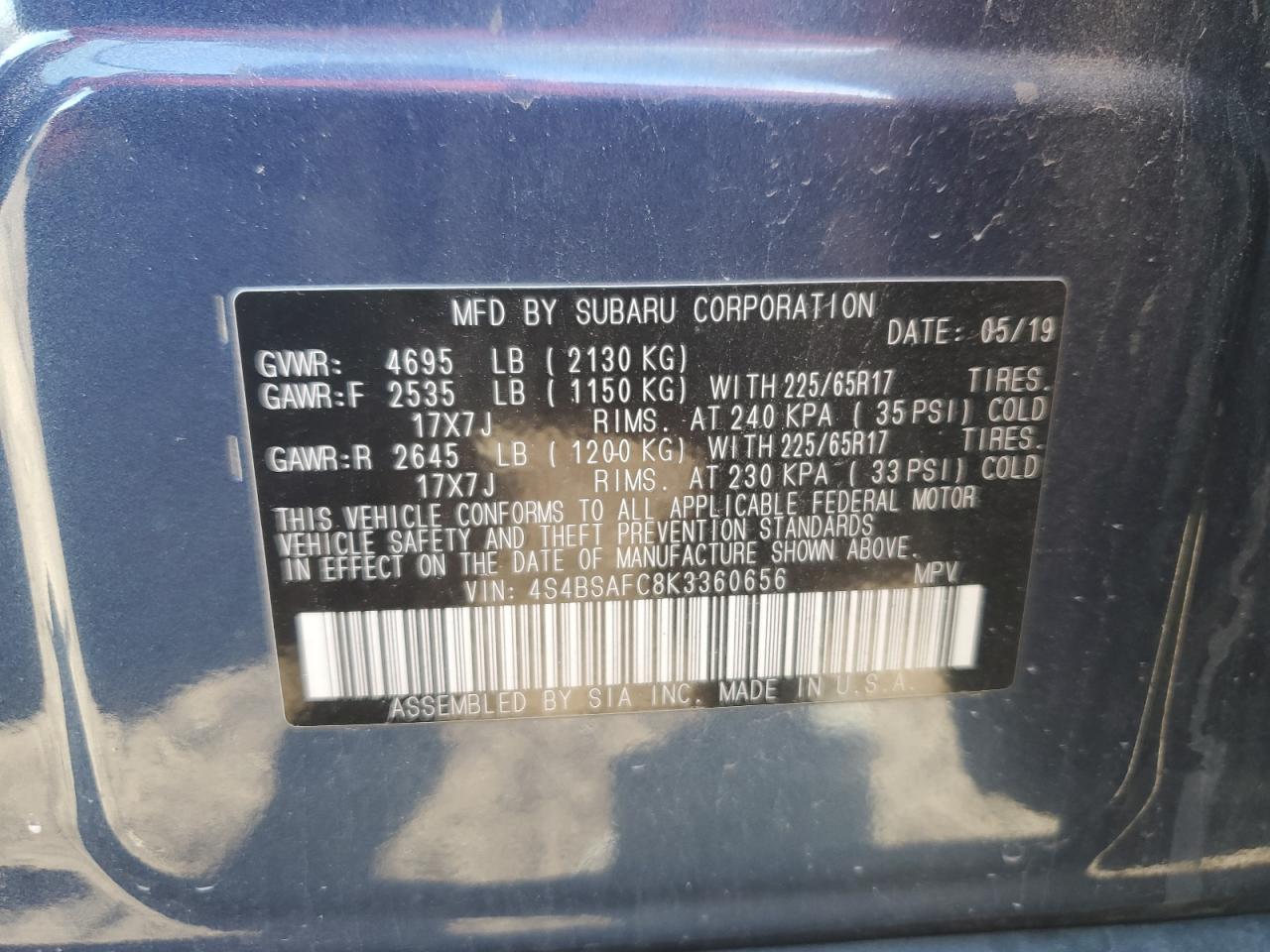 - ВИН: 4S4BSAFC8K3******