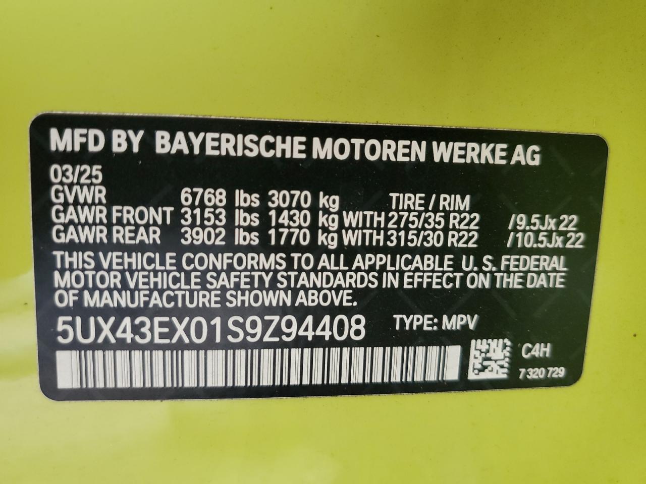 - ВИН: 5UX43EX01S9******