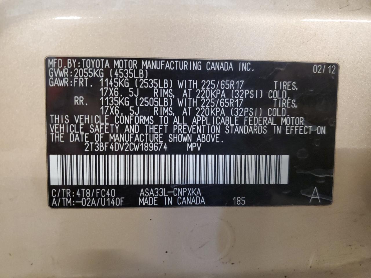 - ВИН: 2T3BF4DV2CW******