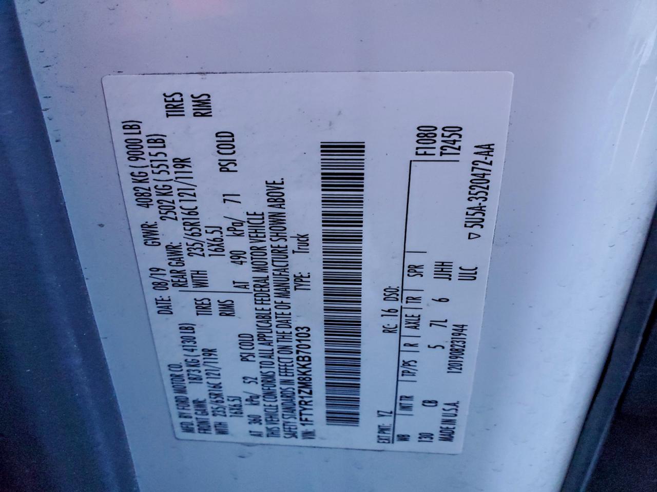 - ВИН: 1FTYR1ZM8KK******