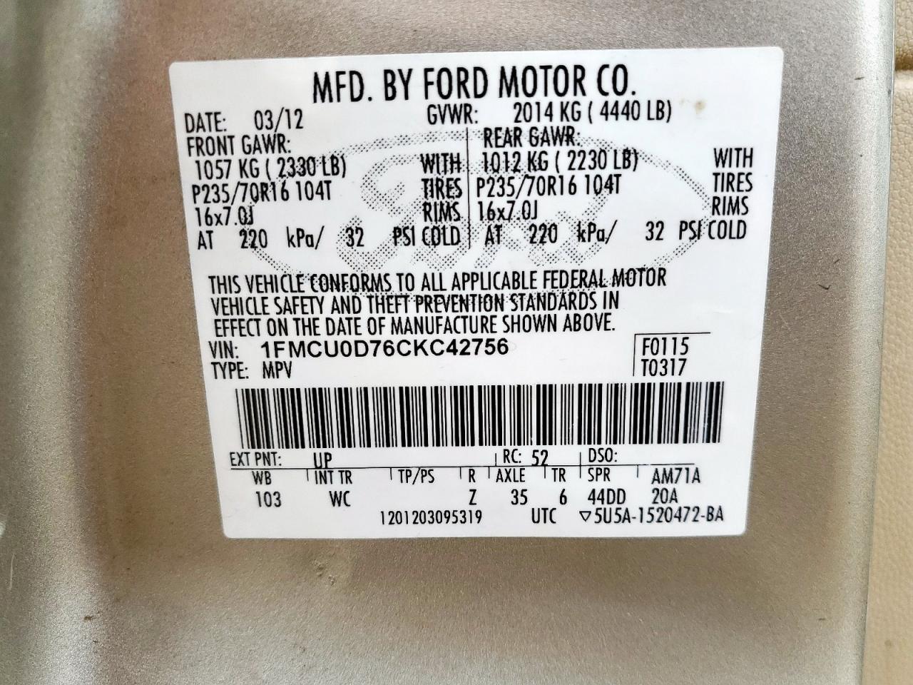 - ВИН: 1FMCU0D76CK******